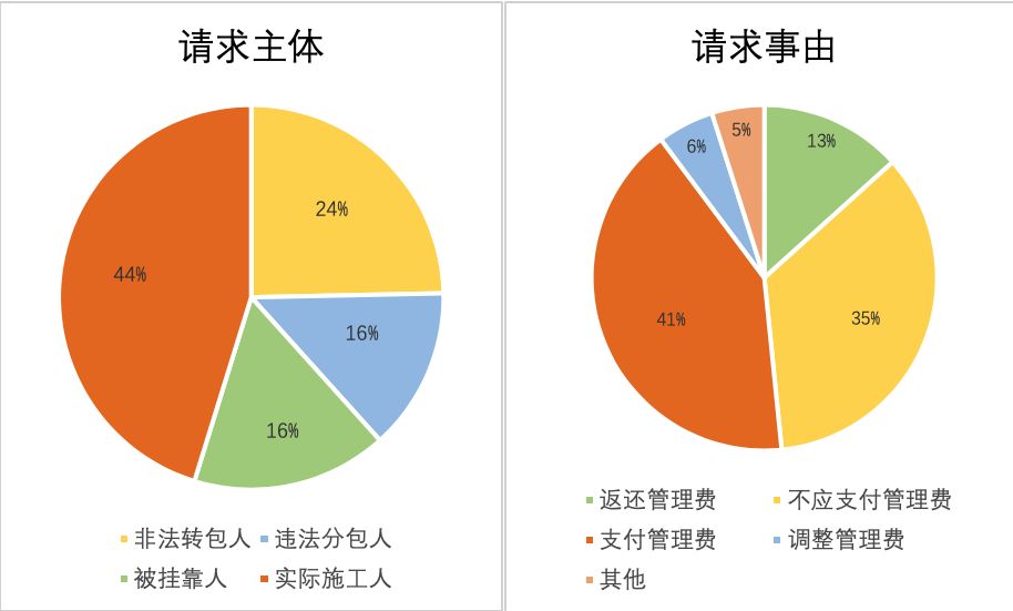在管理费纠纷中,主要的请求主体为实际施工人,其后依次为非法转包人、被挂靠人和违法分包人。作为实际施工人其请求的事由一般为不应支付管理费或返还管理费,而作为非法转包人、违法分包人及被挂靠人其请求一般为支付管理费。在请求事由上,请求支付管理费的比例最大,往后依次为不应支付管理费、返还管理费、调整管理费及其他。