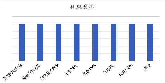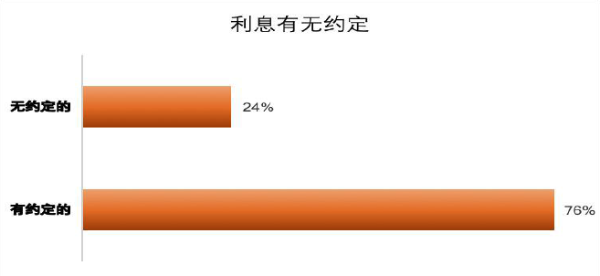约定利息计算标准多样。根据数据样本显示,合同中对利息有约的占大部分,约定计算标准多样,有同期贷款利率、两倍贷款利率、年息24%、年息15%、月息2%、月息1.2%、其他。