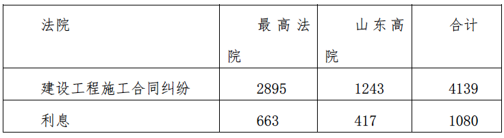 2014年1月1日到2018年5月1日,最高法院及山东高院建设工程施工合同纠纷案件共4139件,其中最高法院2895件、山东高院1243件。涉及到利息的,最高法院663件、山东高院417件。从年度数量来看,2014年631件、2015年965件、2016年1141件、2017年1232件、2018年因裁判文书公开时效原因无法完全检索截止5月1日170件,数量呈上升趋势。究其原因,建筑行业快速发展,法律法规、司法解释等不完善,导致问题层出不穷。