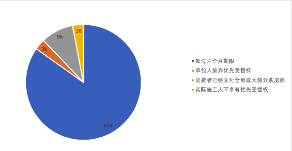 不支持优先受偿权的原因主要有:1、超过6个月的期限(28个)2、承包人放弃优先权 (1个)3、消费者已经支付全部或大部分购房款(3个)4、实际施工人不享有优先受偿权(1个)。